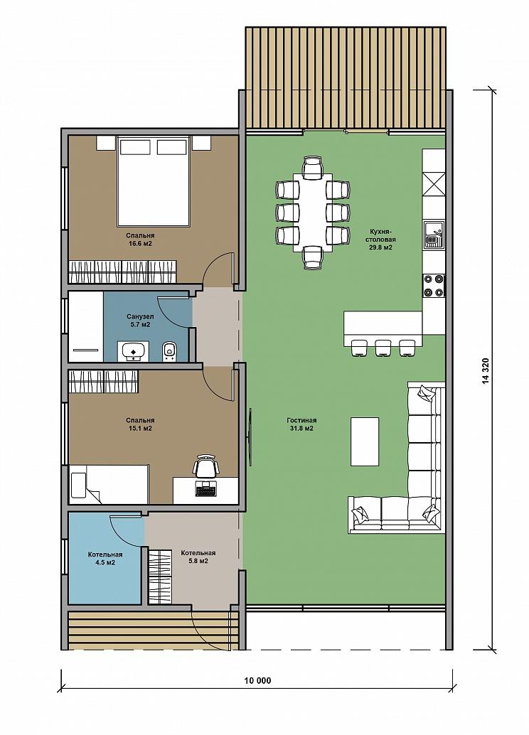 Простота форм – коробка в виде вытянутого прямоугольника, двускатная крыша, минималные свесы. Жесткий каркас из опорных клееных балок. Второй свет на всей протяженности или в одной из торцевых частей. Панорамное остекление, максимум свободного пространств.